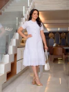 Vestido com modelagem clássica e feminina, confeccionado em tecido trabalhado com leve textura e delicados detalhes geométricos. Possui gola redonda estilo boneca, mangas curtas com acabamento em renda delicada e detalhe de botões decorativos na parte frontal, que não são funcionais.A cintura é levemente marcada, valorizando a silhueta, enquanto a saia apresenta recorte com barrado com pregas que proporciona movimento suave e elegante ao caminhar. A peça é totalmente forrada, garantindo conforto e segurança. O fechamento é feito por zíper oculto na parte de trás, conferindo praticidade e perfeito caimento.