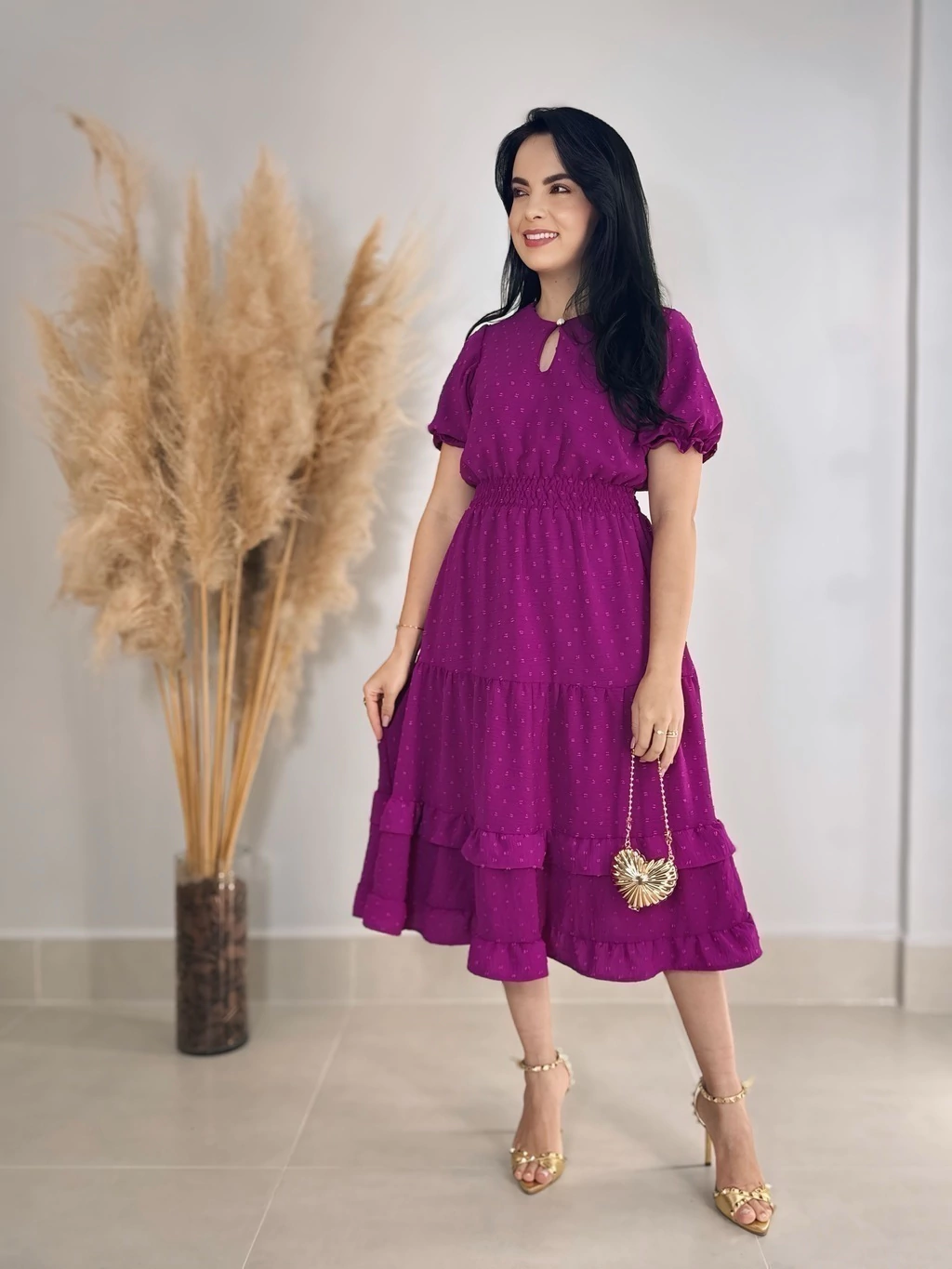Vestido midi com manga curta, gola gota com botão, lastex na cintura. Comprimento midi e saia três marias, possui forro,